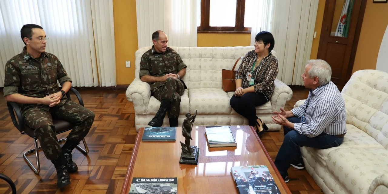 IMPRENSA/Ponta Grossa - Hoje (09) o secretário municipal de Agricultura, Pecuária e Abastecimento (SMAPA), Ivonei Afonso Vieira, realizou uma visita de cortesia ao novo General da 5ª Brigada de Cavalaria Blindada (BDA), Alcides Valeriano de Faria Junior. No encontro o General ainda recebeu um quadro com os mascotes do programa Feira Verde, chamados de ‘Zé Verdinho e Zé Clamufadinho’, nome dado em referência a homenagem pela parceria entre a Prefeitura e o BDA.