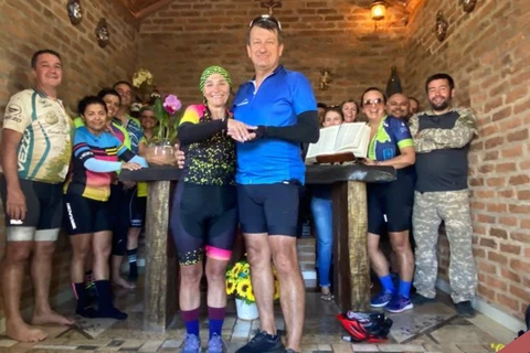 COM ASSESSORIAS - Teve lágrima, teve chuva, teve subida, teve descida. Teve abraço, teve riso, teve até casamento marcado. Um grupo de 15 paroquianos, vinculados ao movimento de células da Paróquia Santa Rita, foi enviado na sexta, 3, para peregrinar, de bicicleta, um trecho de 311 km no Caminho da Fé. Os peregrinos saíram da cidade paulista de Águas da Prata no domingo e concluíram o trajeto no Santuário Nacional de Aparecida nesta quinta, 9.