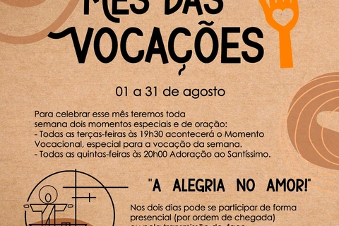 COM ASSESSORIAS - Agosto é o Mês Vocacional. Pela Diocese de Ponta Grossa, as paróquias têm abusado da criatividade para refletir sobre a importância das vocações e de se rezar por elas, sempre. São adorações, momentos devocionais, mas também encenações teatrais, que têm como pano de fundo as diferentes vocações, e campanhas de arrecadação de alimentos e material de limpeza voltadas para os seminários. Tudo vai se desenrolar nesses 30 dias, em especial, nas paróquias Nossa Senhora do Perpétuo Socorro, de Irati; Menino Jesus, de Reserva, Bom Jesus e Nossa Senhora do Pilar.