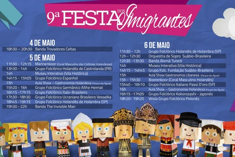 Serviço:A programação do evento inicia nesta sexta, às 18h. No sábado e domingo as comemorações continuam, a partir das 11h o Parque Histórico abrirá com uma vasta lista de atividades. Mais informações pelo telefone 42 98433-4636, a agenda completa da Festa dos Imigrantes está disponível no site
