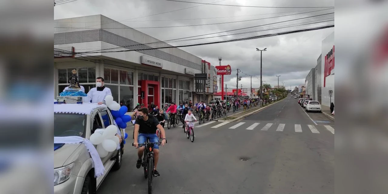 COM ASSESSORIAS - A comemoração do dia da padroeira do Brasil já começou e de uma forma bem diferente. A chuva deu uma trégua e o passeio ciclístico ‘Pedalando em Louvor a Nossa Senhora Aparecida’ acabou saindo e chamando a atenção de muita gente pelo Bairro Nova Rússia, na região do Santuário Diocesano de Nossa Senhora Aparecida/Paróquia São Sebastião. O próprio reitor do santuário, padre Sandro Maciel Ferreira, preferiu ir de bike, acompanhando a imagem da santa, que foi levada em um carro todo ornamentado com flores e balões coloridos.