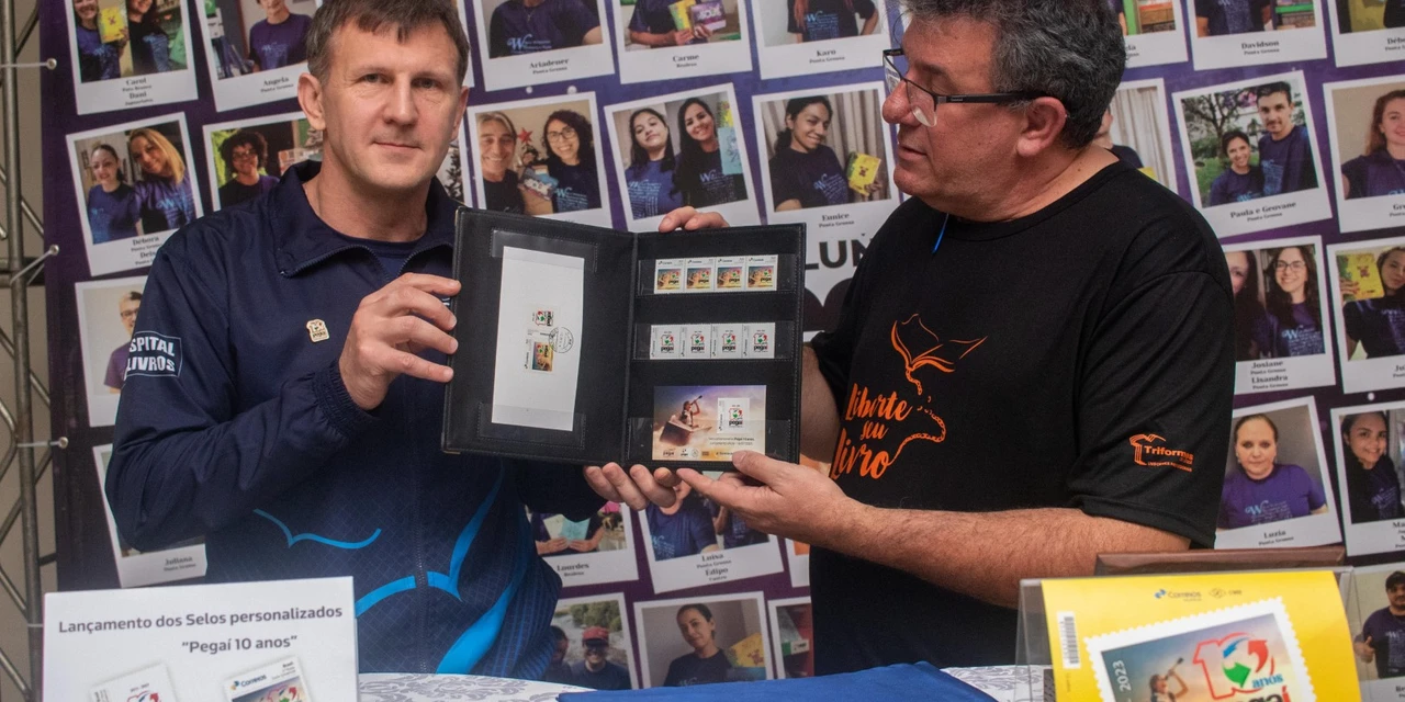 COM ASSESSORIAS - Para comemorar os 10 anos de história do Pegaí, o Instituto Pegaí Leitura Grátis em parceria com a Empresa Brasileira de Correios e Telégrafos lançou no último domingo (16) um selo em homenagem à data. A apresentação do material personalizado aconteceu na sede da APCEF - Associação da Caixa Econômica Federal, em Ponta Grossa (PR), durante a festa de 10 anos do Pegaí e reuniu membros do grupo gestor do Instituto, representante dos Correios e dezenas de voluntários e familiares. As peças filatélicas, produzidas pelo voluntário Luciano Barboza, foram lançadas em dois modelos. O primeiro traz em sua edição a imagem dos 10 anos do projeto, com destaque para o início em 2013, até o seu aniversário em 2023. Enquanto que o segundo projeta a missão do Pegaí Leitura Grátis de “aproximar livros sem leitores de leitores sem livros”.