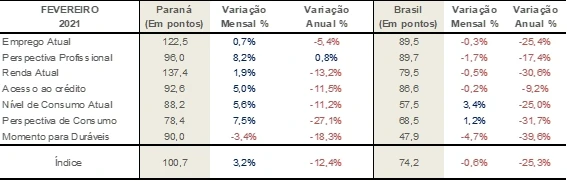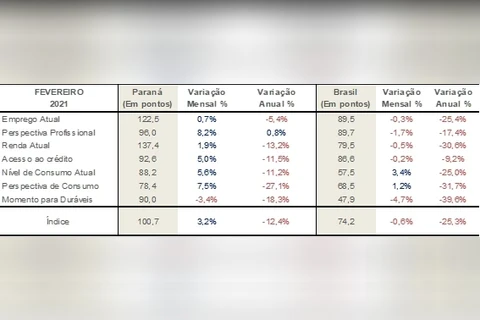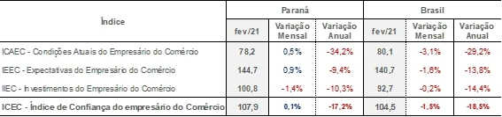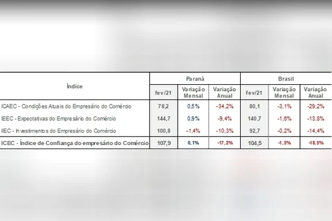 Reagindo às expectativas dos consumidores, o Índice de Confiança do Empresário do Comércio (Icec) também é considerado positivo. Com 107,9 pontos e variação mensal de 0,1%, o indicador do otimismo do empresariado paranaense vai na contramão do resultado nacional, que teve queda de 1,5% em fevereiro na comparação com janeiro, e está em 104,5 pontos.