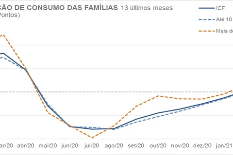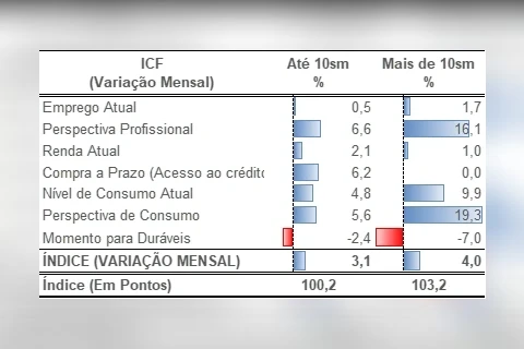 A melhor projeção de consumo está entre as famílias de maior renda, entre as quais o ICF cresceu 4,0% em relação a janeiro e está em 103,2 pontos. O índice também teve crescimento de 3,1% entre as famílias com renda menor e marca 100,2 pontos.