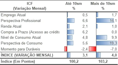 Praticamente todas as variáveis apresentam variação mensal positiva, em ambas as classes econômicas, exceto Momento para Compra de Bens Duráveis, a única em queda, o que pode estar relacionado com a maior dificuldade no acesso ao crédito. Os quesitos com melhor pontuação são Emprego Atual (122,5 pontos) e Renda Atual (137,4 pontos).