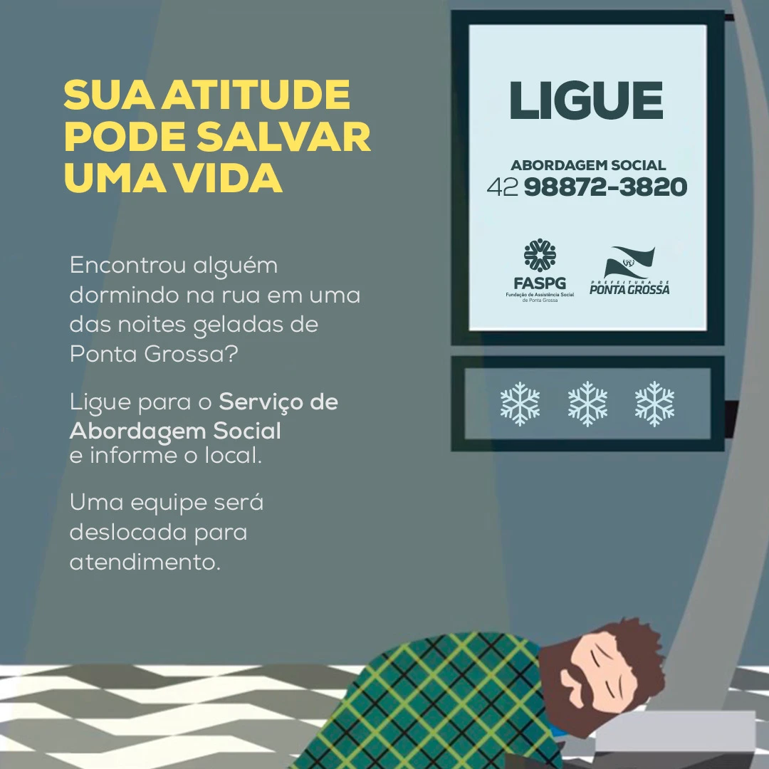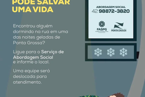 IMPRENSA/Ponta Grossa - Ponta Grossa é conhecida pelas baixas temperaturas que começam a cair a partir de outono, é a época que os casacos e cobertas começam a sair dos armários para aquecer o corpo. Mas e a população de rua como faz? A Prefeitura Municipal realiza doações de mantas, agasalhos e comidas para aquecer, e neste ano terá mais uma novidade para auxiliar os que mais precisam. O Serviço Especializado em Abordagem Social, ligado a Fundação Municipal de Assistência Social (Faspg), passou a disponibilizar um telefone de plantão, onde os munícipes poderão entrar em contato caso encontrem alguém dormindo na rua, nas noites geladas da cidade. As chamadas devem ser feitas para o 42 98872-3820.