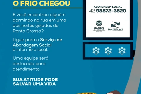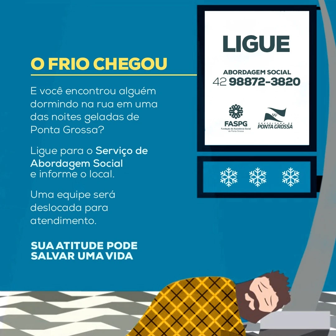 O Serviço Especializado em Abordagem Social, ligado a Fundação Municipal de Assistência Social (Faspg), está disponibilizando um telefone de plantão, onde os munícipes poderão entrar em contato caso encontrem alguém dormindo na rua, nas noites geladas da cidade. As chamadas devem ser feitas para o 42 98872-3820, os encaminhamentos serão pelo serviço ou livre demanda. O local destinado a receber as pessoas em situação de rua será o ginásio de esportes Zucão, rua General Rondon, 2-158, na Nova Rússia.