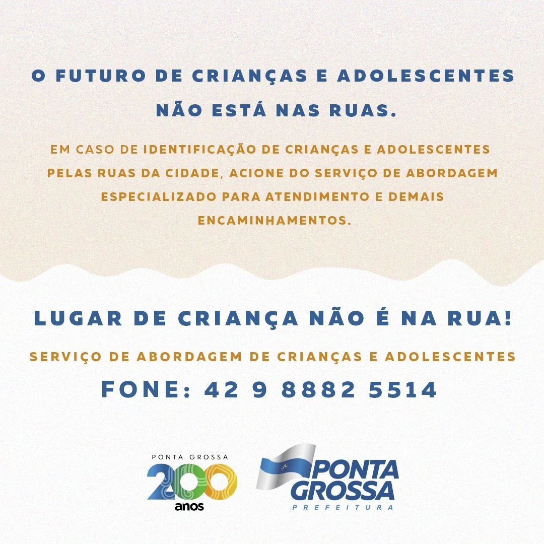 A equipe do Serviço de Abordagem Social Especializado para Crianças e Adolescentes poderá ser acionada pelo número (42) 98882-5514 (WhatsApp).