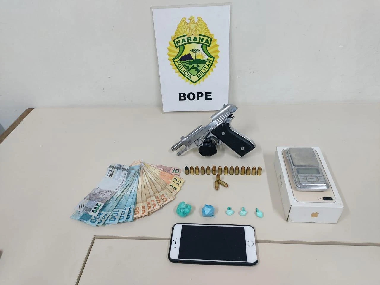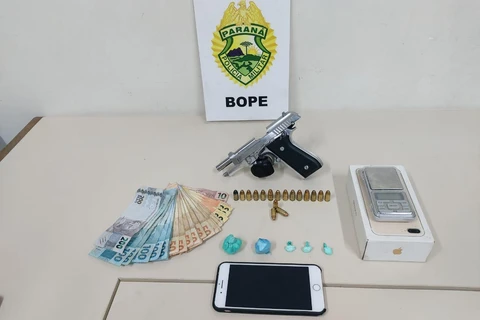 Policiais do Batalhão de Operações Especiais da PM abordaram a residência onde foi localizada uma pistola calibre 380, cinco buchas de cocaína, uma balança de precisão e dinheiro.