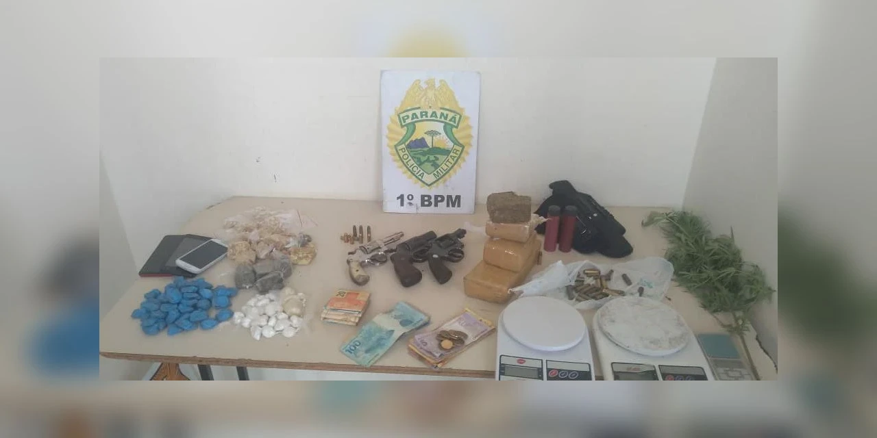 Os policiais foram até o local na manhã de ontem (14) e flagraram 1,4 quilo de maconha, 286 gramas de crack, 76 gramas de cocaína, balanças de precisão e um revólver calibre 32. Segundo a PM, a equipe então seguiu para um segundo endereço e localizou mais dois revólveres calibre 32 e 38, além de munições.