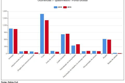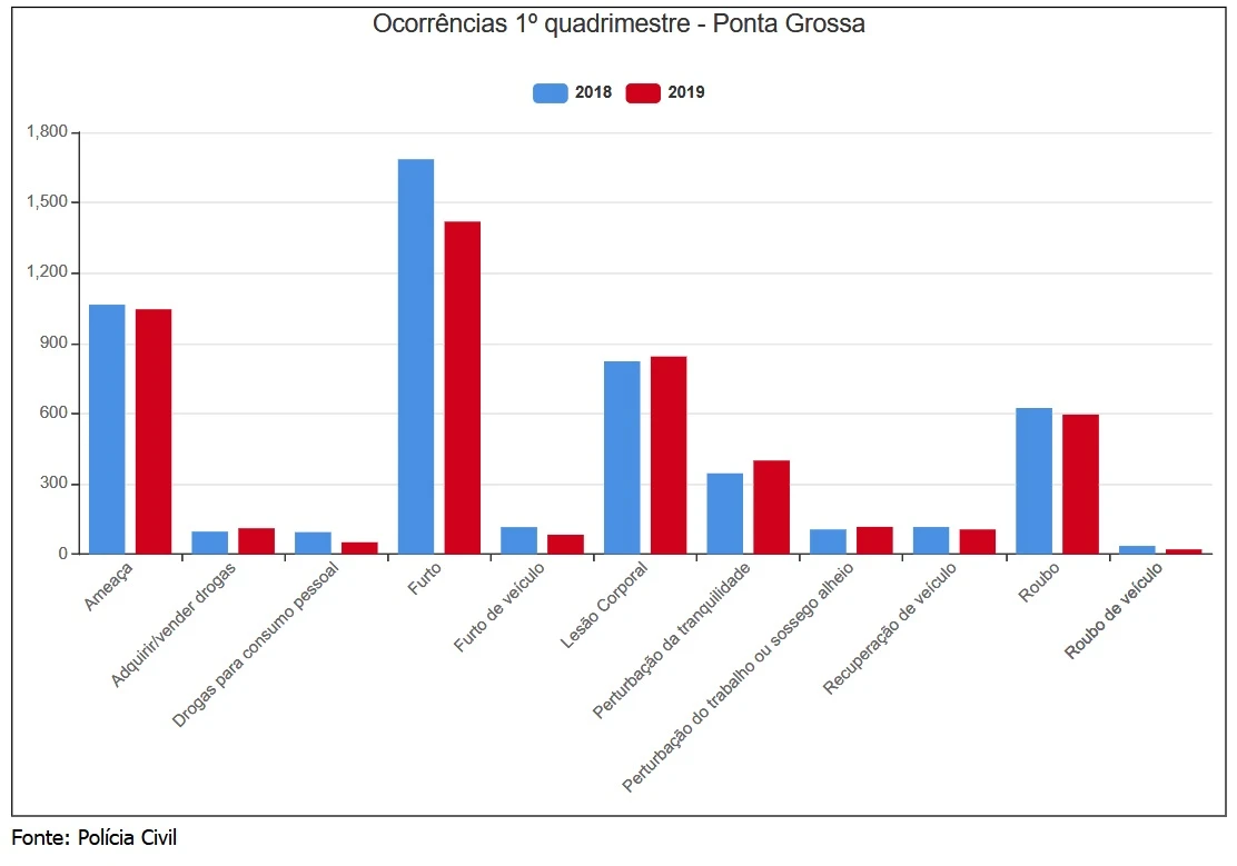 Nos primeiros quatro meses de 2019, a PC de Ponta Grossa registrou menos ocorrências em sete crimes: ameaça (-1,8%), drogas para consumo pessoal (-45,7%), furto (-15,8%), furto de veículo (-27,8%), recuperação de veículo (-9,4%), roubo (-4,4%) e roubo de veículo (-42,8%). Nos dados divulgados pela Civil, apenas quatro crimes tiveram aumento nos registros: adquirir/vender/fornecer ou produzir drogas (+14,5%), lesão corporal (+2,4%), perturbação da tranquilidade (+15,6%) e perturbação do trabalho ou sossego alheio (+11,4%). Esses números tem como base a comparação com o mesmo período do ano passado.