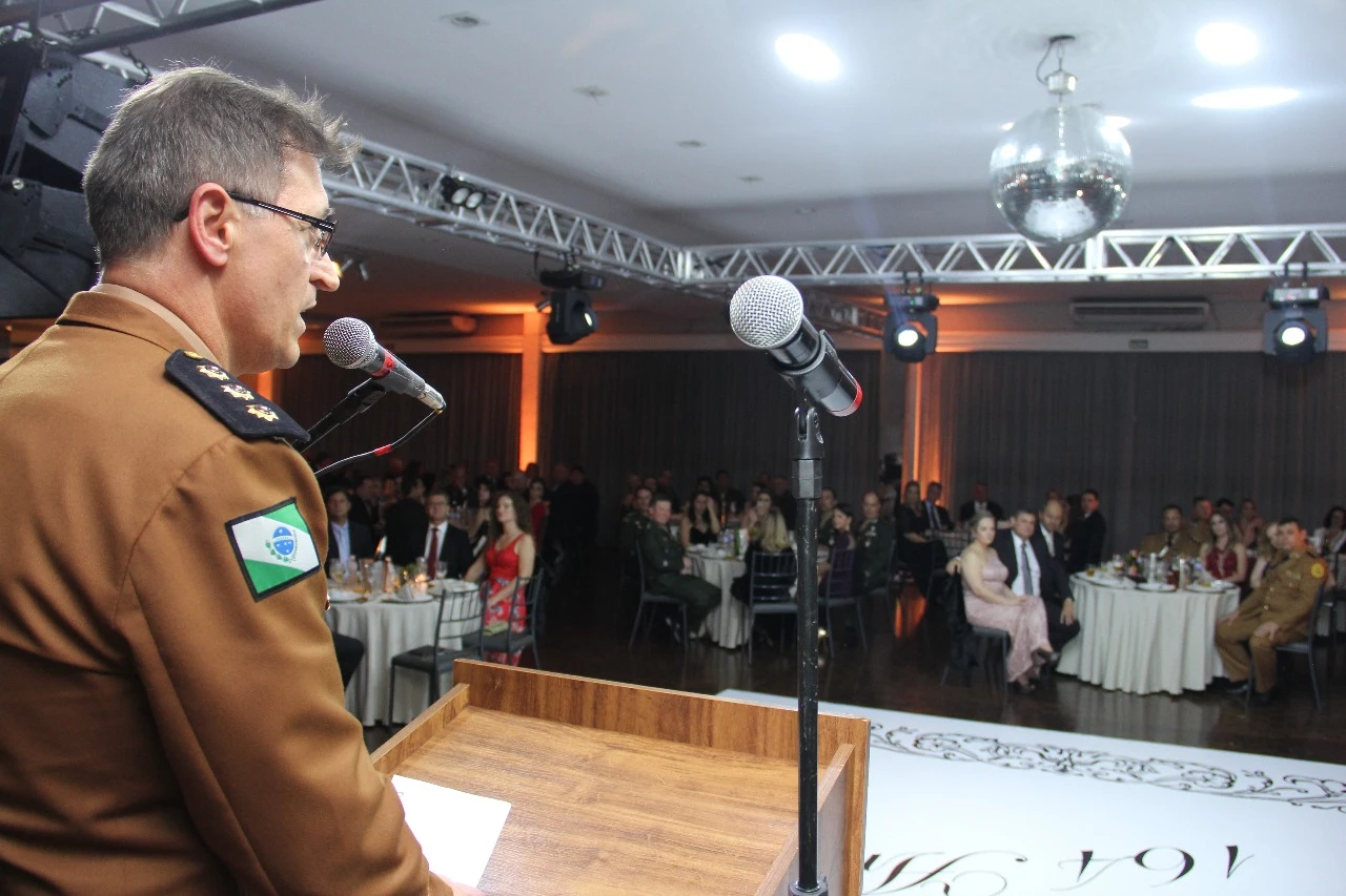 Agradecendo a presença de todos no evento festivo, o Comandante do 4º Comando Regional, Coronel Valdir Tedeschi, frisou em suas palavras a importância de celebrar a data entre amigos, enaltecendo a atividade policial militar: “Há, sim, um misto infindável de alegria, orgulho e honra a serem celebrados em mais este aniversário da PMPR. Existimos para proteger e protegemos pessoas, os locais onde vivem, os bens que possuem, sua cultura, seus valores, os direitos e garantias individuais e coletivas de que são sujeitos. Existimos para proteger e protegemos as suas horas de sono, de trabalho, de estudo e lazer, e fazemos isso 24 horas por dia, 365 dias por ano, há 164 anos.”