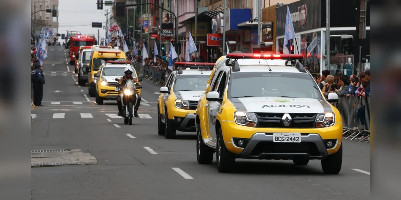 Participando das festividades, integrantes do 1º BPM desfilaram em viaturas utilizadas no policiamento, proteção e socorro aos cidadãos pontagrossenses. Os automóveis, caracterizados e equipados para a atividade policial, atendem às necessidades da população e do efetivo PM, 24 horas por dia.