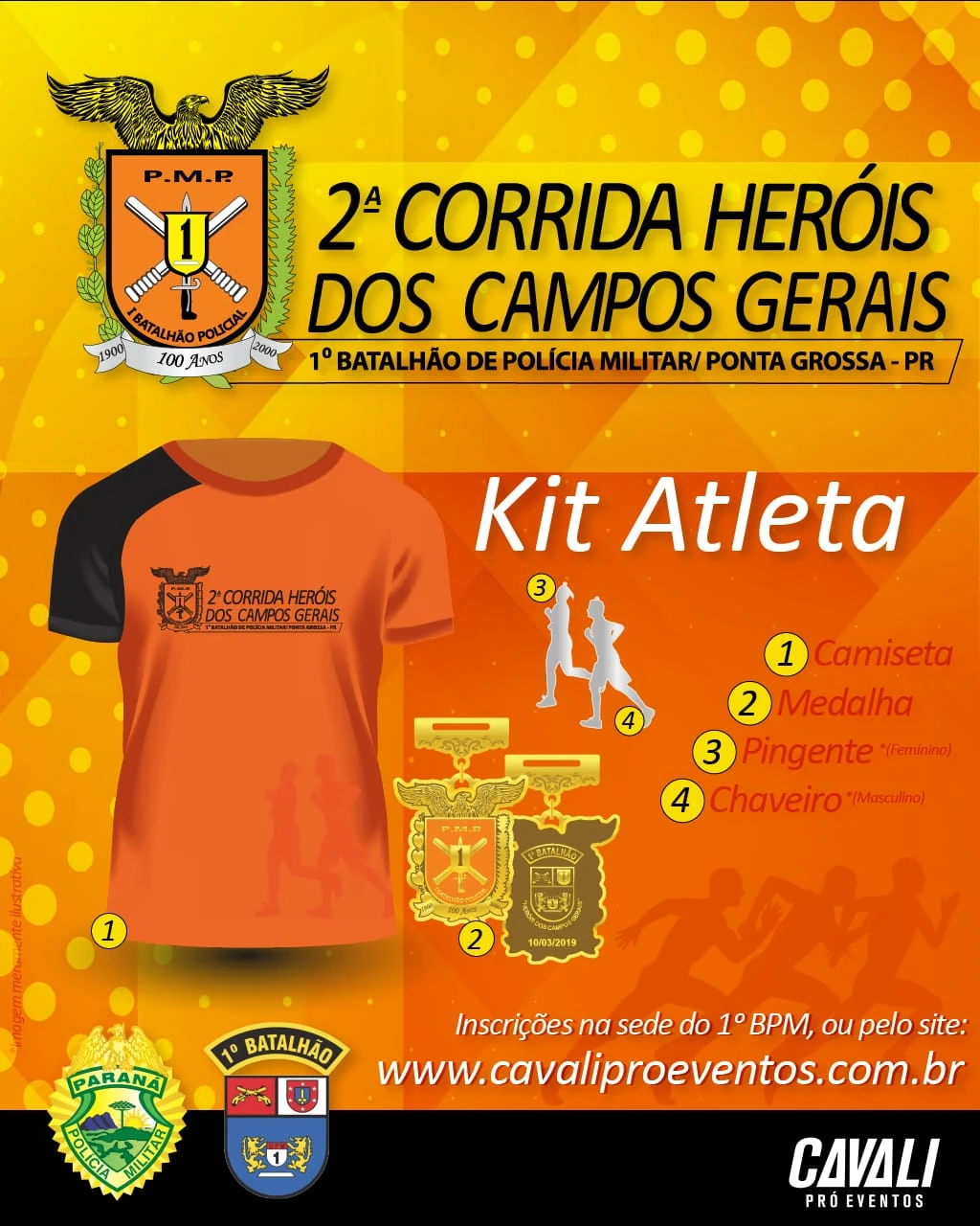 4º CRPM/1º BPM – O 1º Batalhão de Polícia Militar (1º BPM), em parceria com a Cavali Pró Eventos, realizará no próximo dia 10 de março, em Ponta Grossa/PR, a 2ª edição da “Corrida Heróis dos Campos Gerais”.