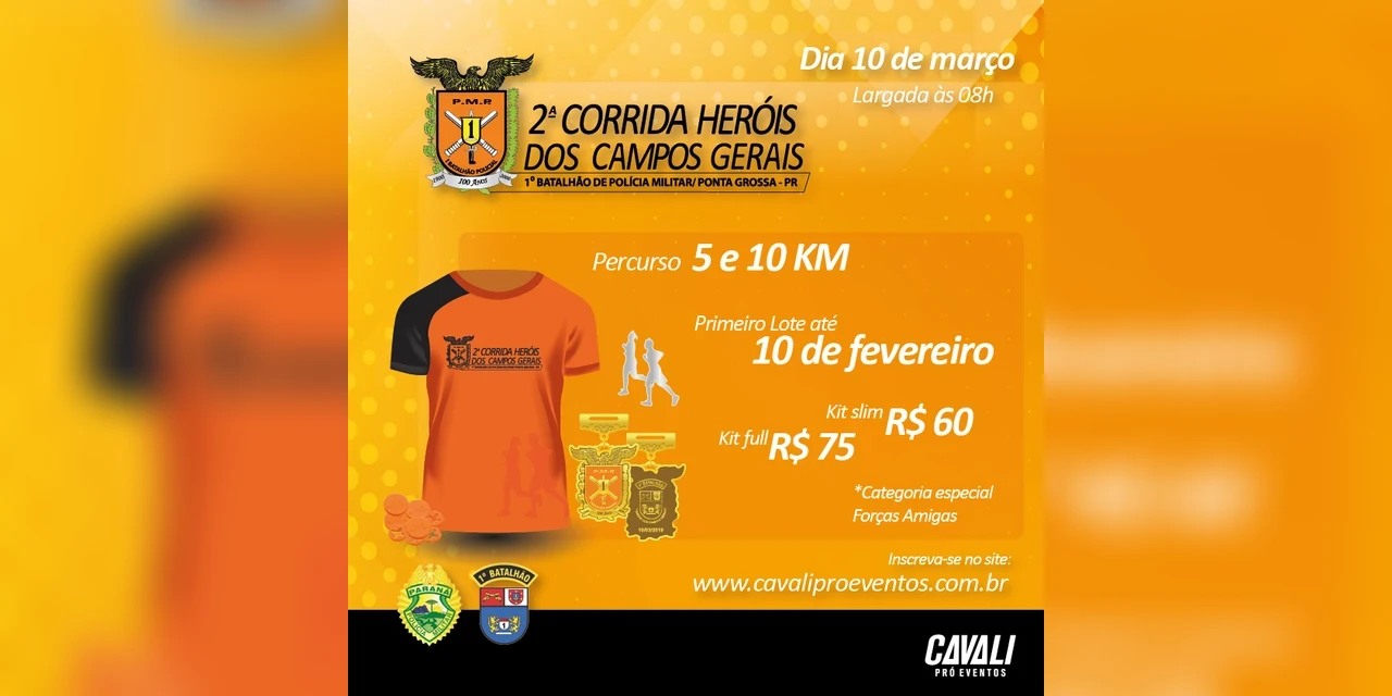 COM ASSESSORIAS - O 1º Batalhão de Polícia Militar (1º BPM), em parceria com a Cavali Pró Eventos, realizará no próximo dia 10 de março, em Ponta Grossa/PR, a 2ª edição da “Corrida Heróis dos Campos Gerais”.