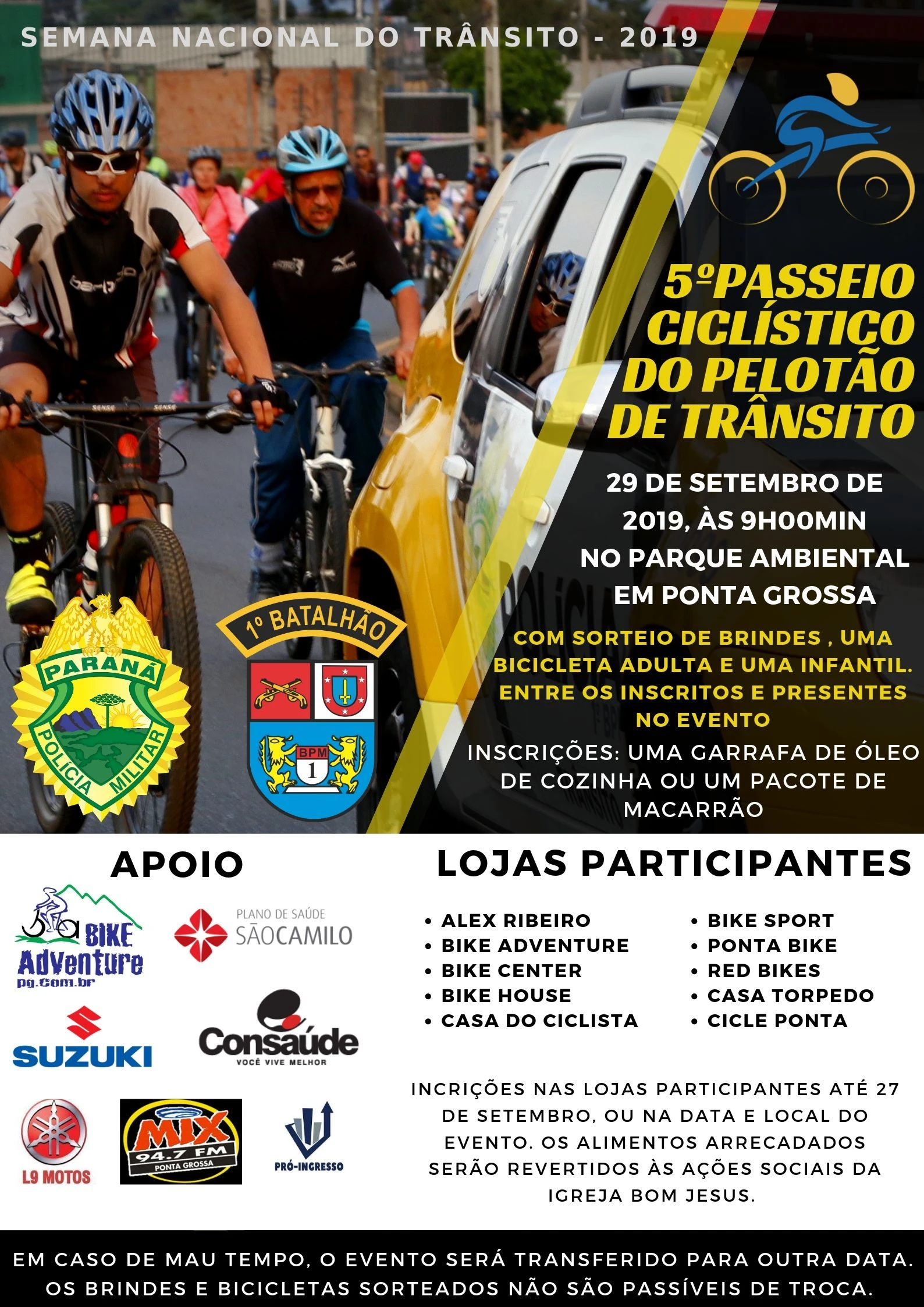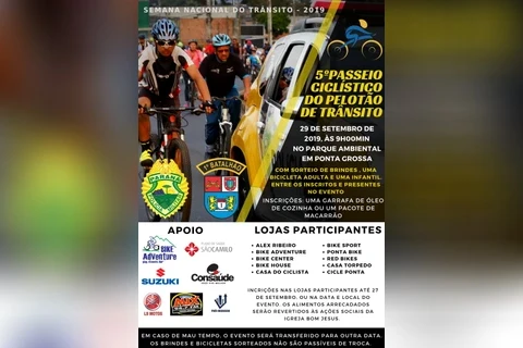O evento, aberto ao público, terá concentração em frente à sede da 1ª Companhia PM, no Parque Ambiental Governador Manoel Ribas, Centro, com saída para o início do passeio às 9 horas. Ao término, haverá sorteio de brindes, dentre eles duas bicicletas!