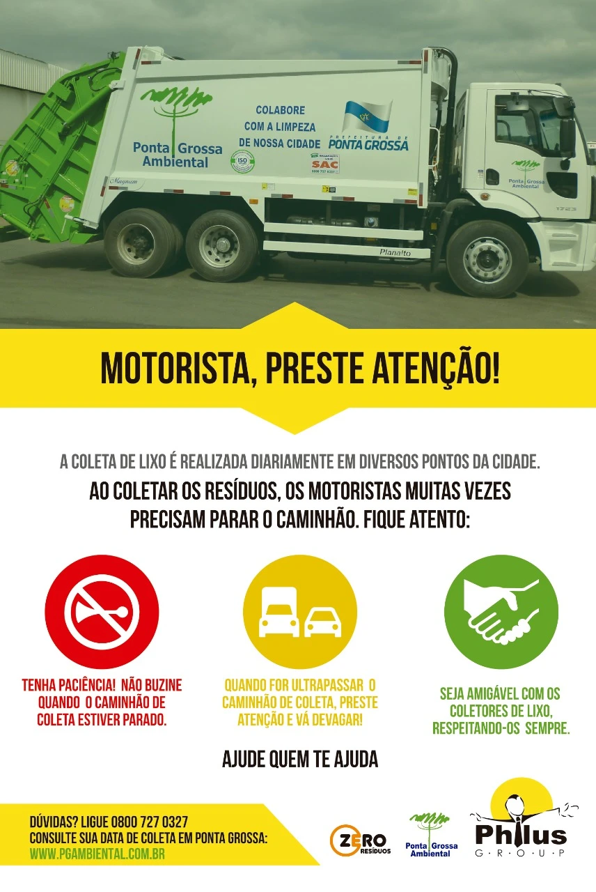 Além disso, a empresa reforçará seus canais diretos de atendimento à população: 0800 727 0327 e a página online, www.pgambiental.com.br, na qual os moradores podem consultar, entre outras informações, datas e horários de coleta na cidade. “Ao coletar resíduos, muitas vezes, os motoristas precisam parar o caminhão de lixo. É uma questão de logística de operação que envolve, entre outros aspectos, segurança para os garis e para a população. É preciso ter atenção, pois somos todos responsáveis por um trânsito mais seguro”, diz Borsato.