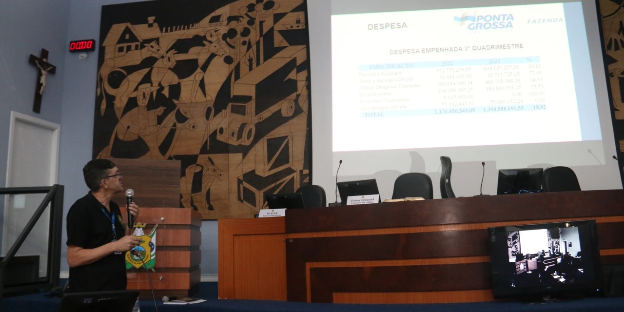 COM ASSESSORIAS - A Prefeitura de Ponta Grossa, através da Secretaria Municipal da Fazenda, apresentou nesta quinta-feira (29), no plenário da Câmara de Vereadores, em audiência pública, a prestação de contas do 3º quadrimestre de 2023, consequente o fechamento do exercício financeiro e orçamentário. Os dados apresentados pelo secretário da Fazenda, Cláudio Grokoviski, apontam que as medidas tomadas pela gestão para melhorar as receitas e reduzir gastos asseguraram o equilíbrio das contas em 2023, mesmo com a queda das receitas provenientes de repasses.