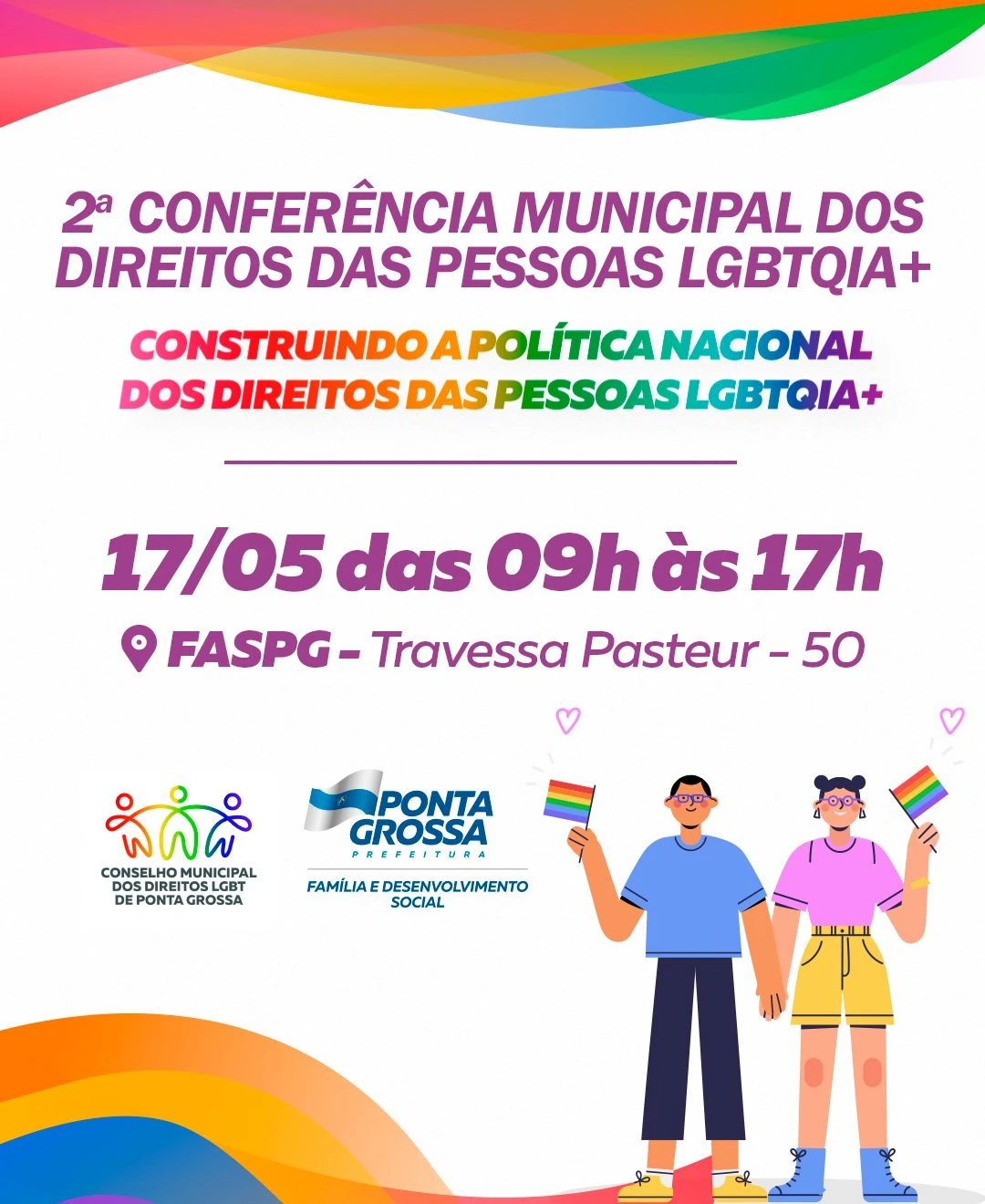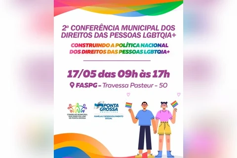 COM ASSESSORIAS - A cidade de Ponta Grossa recebe, no dia 17 de maio, sexta-feira, a 2ª Conferência Municipal dos Direitos das Pessoas LGBTQIAPN+. O evento, que ocorre das 9h às 17h, tem como tema “Construindo a Política Nacional dos Direitos das Pessoas LGBTQIAPN+”. A conferência será realizada na sede da Fundação de Assistência Social de Ponta Grossa (FASPG), localizada na Rua Ernesto Vilela, nº 61, esquina com a Travessa Pasteur, no Centro da cidade.