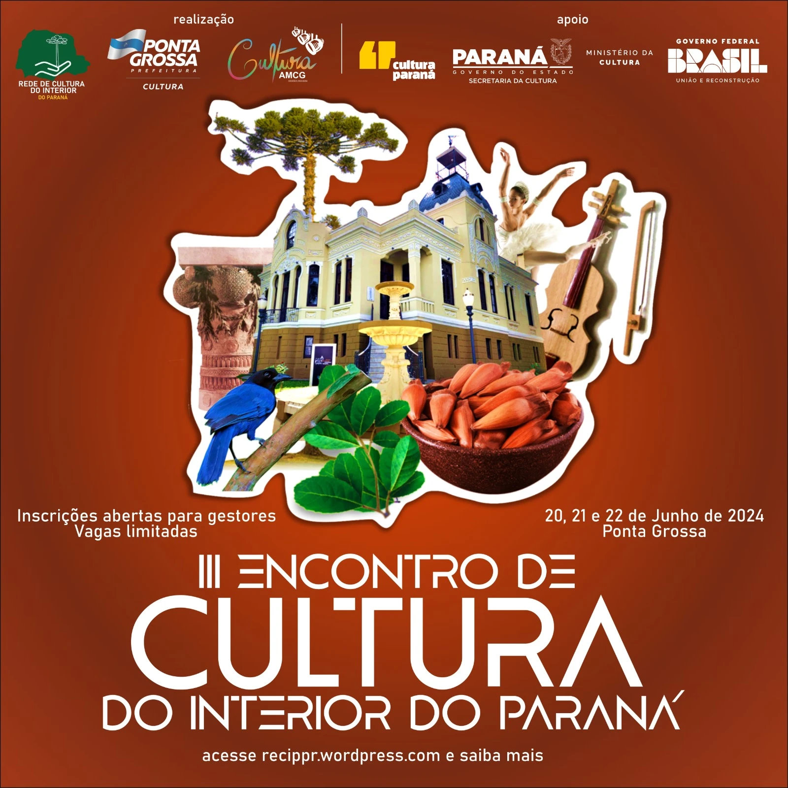 COM ASSESSORIAS - Ponta Grossa recebe gestores e gestoras de cultura de todo o Estado, a partir de quinta-feira. Até sábado, eles participam do 3º Encontro de Cultura do Interior do Paraná. Durante três dias, discutirão questões relacionadas ao segmento cultural. A realização é da Rede de Cultura do Interior do Paraná (RECIP), AMCG Cultura e Prefeitura de Ponta Grossa, através da Secretaria Municipal de Cultura. O evento conta ainda com apoio da Secretaria de Estado da Cultura do Paraná e Ministério da Cultura.