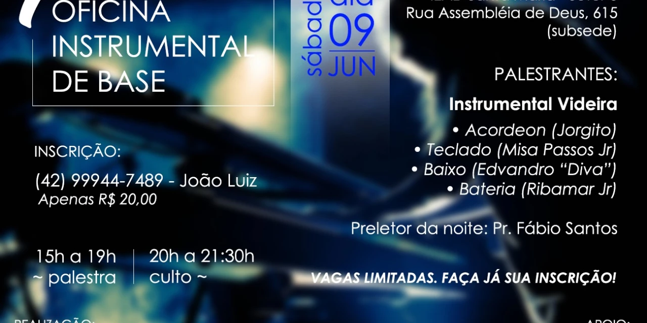 COM ASSESSORIAS - O mês de junho começa com atividade para quem é da área da música. No dia 09 acontece a primeira edição da Oficina Instrumental de Base, que reúne vertentes da prática em conjunto, música de câmara, interpretação e planejamento de estudos e ensaios. A oficina será ministrada pelos integrantes do Grupo Instrumental Videira: Misael Passos Júnior (teclado), Ribamar Júnior (bateria), Edvandro ‘Diva’ (baixo) e Jorgito (acordeon).