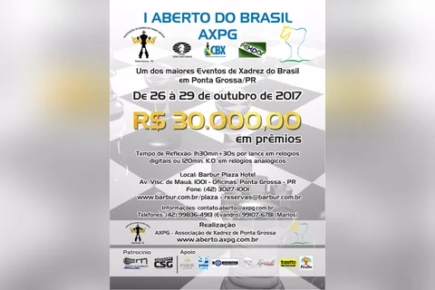 A Associação de Xadrez de Ponta Grossa (AXPG) realiza entre os dias 26 e 29 de outubro o 1º Aberto do Brasil AXPG, no Barbur Plaza Hotel, no bairro de Oficinas. O evento começa às 18h de quinta-feira, (26) e terá a presença de sete Grandes Mestres (GMs), entre eles os enxadristas brasileiros, Rafael Duailibe Leitão e Yago de Moura Santiago; além do argentino, Sandro Mareco e o paraguaio, José Fernando Cubas.