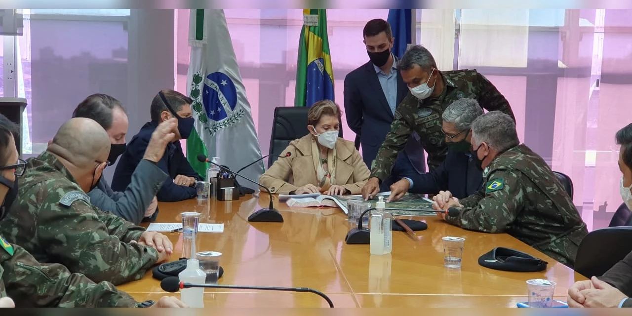 COM ASSESSORIAS - A prefeita Elizabeth Schmidt se reuniu com o General de Divisão, Joarez Alves Pereira Junior, e os integrantes da comitiva dos militares envolvidos no processo de implantação da Escola de Sargentos de Armas (ESA) para alinhamentos, tirar dúvidas, realizar visita técnica nas áreas e demais espaços que poderão ser utilizados. O encontro entre as lideranças aconteceu hoje (19) na sala de reuniões e contou com representantes municipais e estaduais.