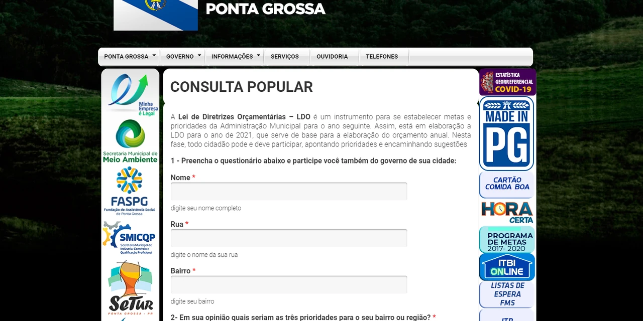 COM ASSESSORIAS - Já está disponível para participação da população a consulta pública para que os próprios ponta-grossenses possam indicar à Prefeitura quais são os setores prioritários de investimentos, além de realizar outras sugestões. Os resultados desta consulta serão usados para embasar a elaboração da Lei de Diretrizes Orçamentárias (LDO), instrumento que estabelece as metas e prioridades da administração para o exercício de 2021, alinhado com as definições do Plano Plurianual do período 2018-2021, e também fará parte da elaboração da Lei Orçamentária Anual (LOA) 2021.