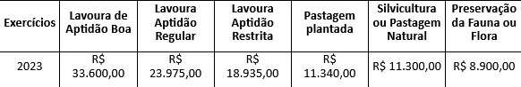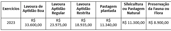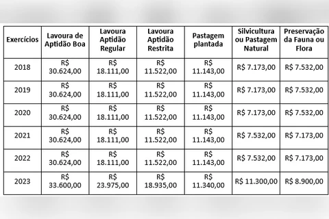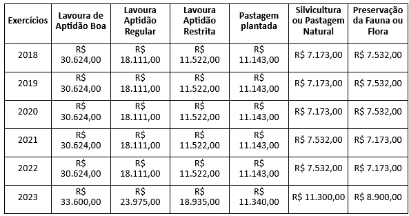 Segue abaixo a planilha de valores do VTN (Valor de Terra Nua) do ano de 2018 a 2023.