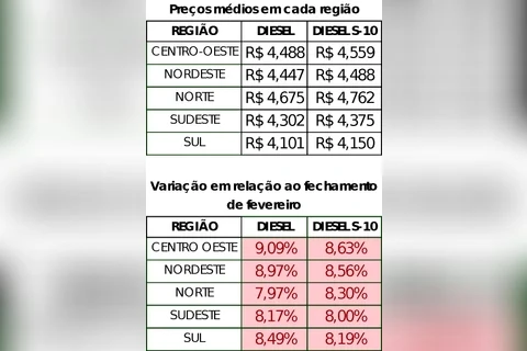Os combustíveis mais baratos foram encontrados no Paraná. O preço médio do tipo comum no Estado foi de R$ 4,068, após aumento de 9,12% em relação ao fechamento de fevereiro. Já o valor médio do litro do tipo S-10 foi de R$ 4,107, com aumento registrado de 8,79%.