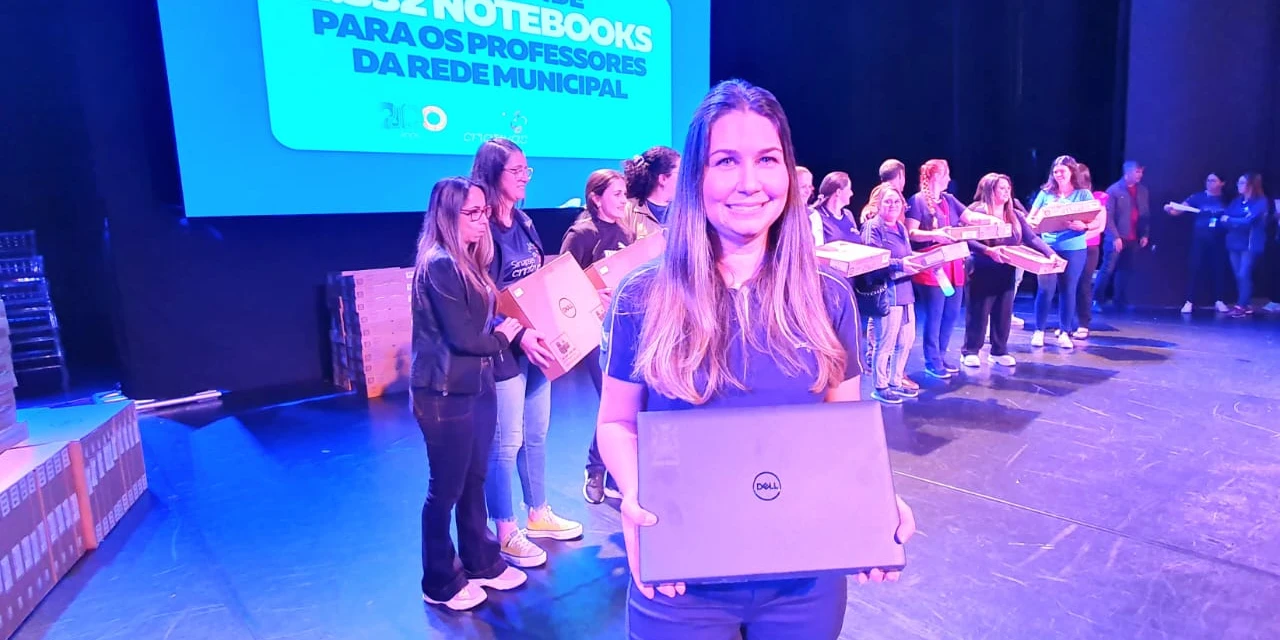 COM ASSESSORIAS - A Prefeita de Ponta Grossa, professora Elizabeth Schmidt, realizou nesta quarta-feira (18), em cerimônia no Cine-Teatro Ópera, a entrega de 2.332 notebooks para os professores da Rede Municipal de Ensino. O evento também homenageou os profissionais, em alusão ao Dia do Professor, comemorado em 15 de outubro.