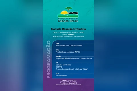O presidente da AMCG e atual prefeito de São João do Triunfo, Abimael do Valle, falou sobre a importância do evento e convocou as lideranças municipais. "A participação de todos os gestores nesse encontro será fundamental para dar continuidade às ações desenvolvidas nos Campos Gerais. Acredito que esse processo de orientação proposto pela AMP é muito importante e demonstra o compromisso da entidade junto aos municípios. Também será mais uma oportunidade para os prefeitos colocarem em pauta temas relevantes para as suas cidades e para a região como um todo", disse.