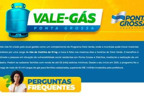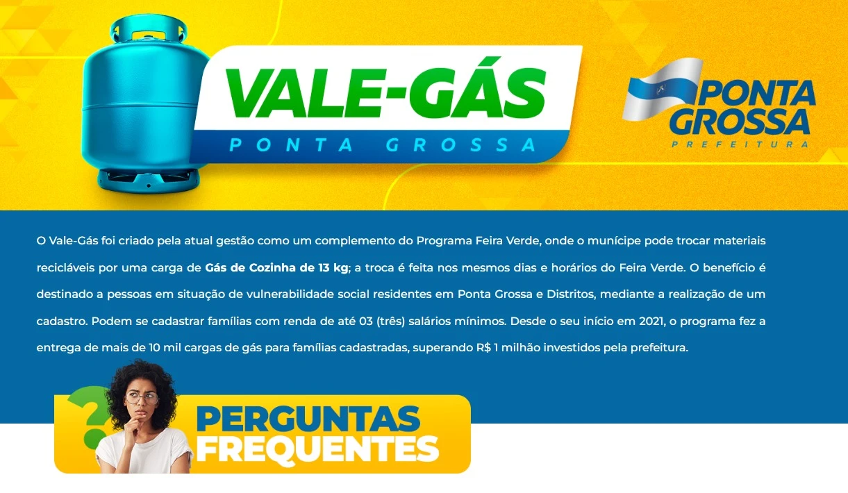 COM ASSESSORIAS - Com o início do programa Feira Verde, a Prefeitura de Ponta Grossa começa na próxima segunda-feira (02/02) o cadastro dos moradores que podem participar do 'Vale Gás' – iniciativa que segue a mesma dinâmica do Feira Verde, destinada para famílias que possuem renda de até três salários mínimos. Neste ano, o cadastro será 100% on-line: basta acessar o site www.pontagrossa.pr.gov.br/valegas e seguir o passo a passo.