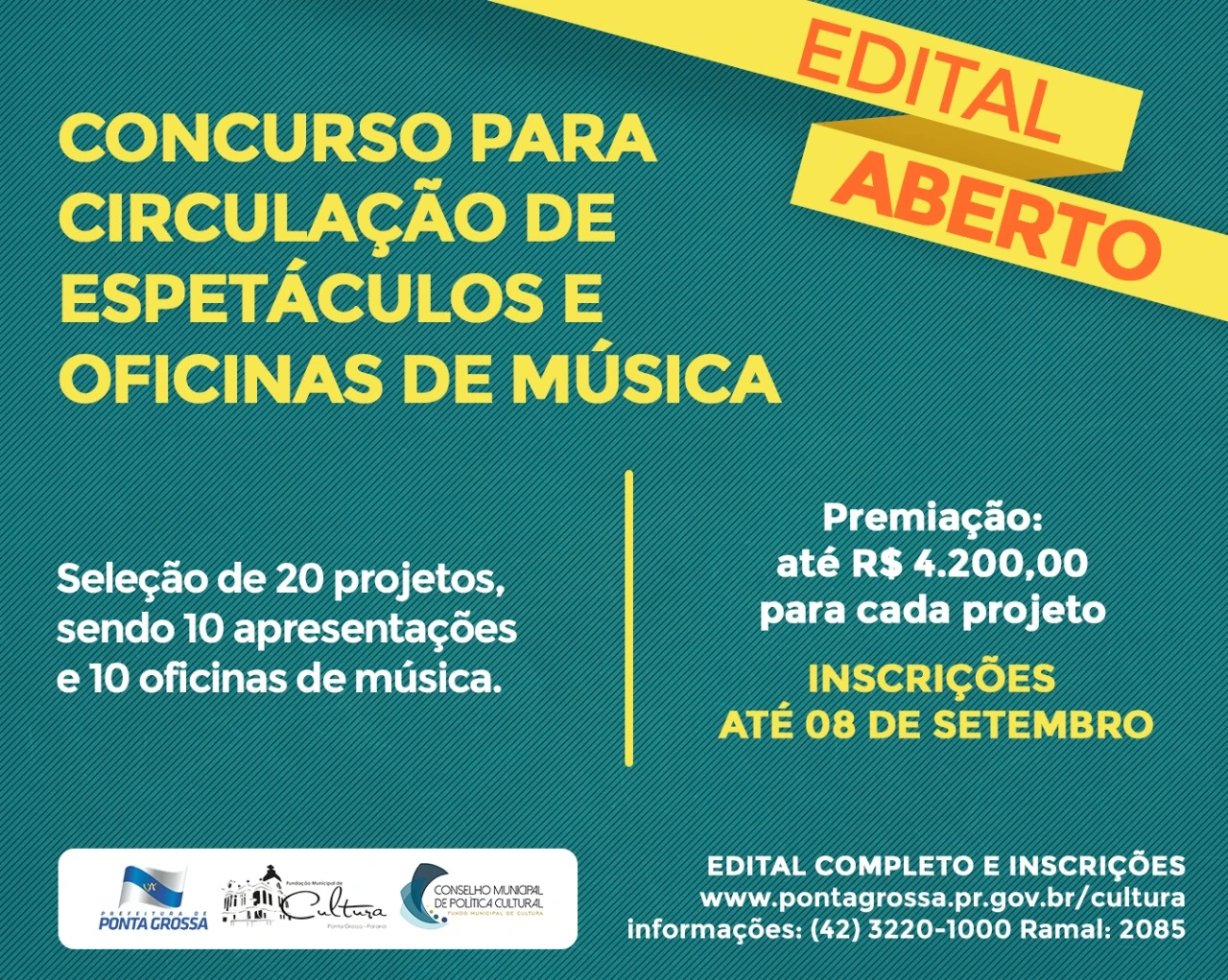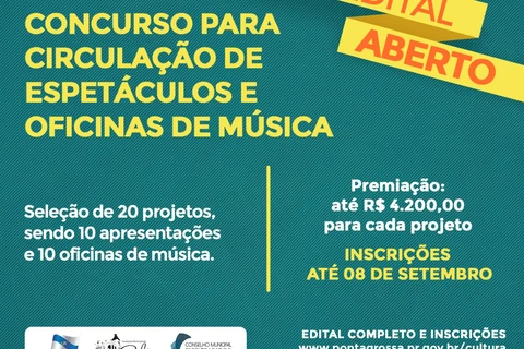 Luana Caroline Nascimento/Ponta Grossa - A Prefeitura de Ponta Grossa, a Fundação Municipal de Cultura e o Conselho Municipal de Política Cultural abriram as inscrições para o Concurso de Circulação de Espetáculos e Oficinas de Música 2019. Serão premiados 20 projetos, sendo cinco prêmios de R$ 2.100 para apresentações com até dois músicos, cinco prêmios de R$ 4.200 para apresentações com três ou mais músicos e 10 prêmios de R$ 3.150 para oficinas de música.