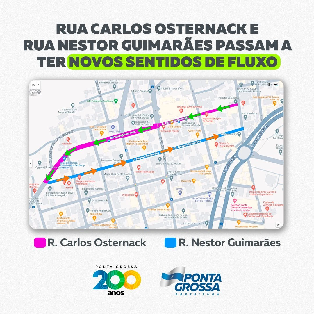 COM ASSESSORIAS - A Prefeitura de Ponta Grossa alerta os motoristas que trafegam pela região Central sobre a implementação de novos sentidos de fluxo nas ruas Carlos Osternack/Joaquim de Paula Xavier e Nestor Guimarães a partir desta terça-feira (14).