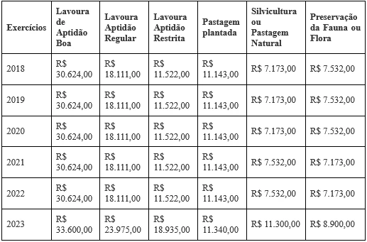 De acordo com o secretário da Fazenda, Cláudio Grokoviski, a primeira parcela ou quota única do imposto vence no dia 29 de setembro. Já as demais parcelas vencem no último dia útil de cada mês subsequente, acrescida de juros. "É importante que o produtor fique atento à planilha publicada no Diário Oficial do Município, Edição nº 3.656, de 02 de agosto de 2023, com o Valor da Terra Nua (VTN) para o exercício 2023", explicou. A planilha (abaixo) demonstra como o proprietário deve fazer a distribuição das áreas de aptidão agrícola de cada propriedade e fazer o lançamento de preço das terras conforme a tabela acima, para o exercício de 2023.