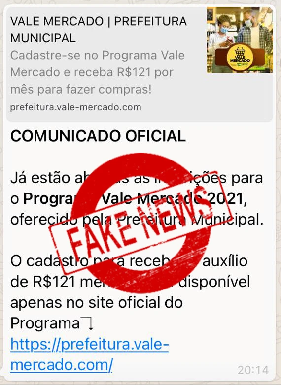 COMO ASSESSORIAS - A Prefeitura de Ponta Grossa, através da Secretaria Municipal de Agricultura, Pecuária e Abastecimento, alerta a população sobre publicações falsas (Fake News) que circulam em grupos de WhatsApp, sobre um programa chamado "Programa Vale Mercado 2021 e outra publicação sobre o "CRAS – Solicite sua Cesta Básica 2021". O Programa Vale-Mercado, realizado pela SMAPA, conta com agendamento exclusivo através do site da Prefeitura.