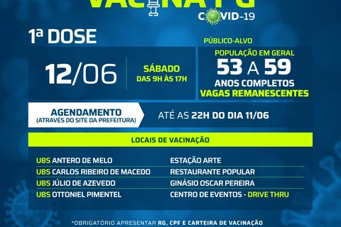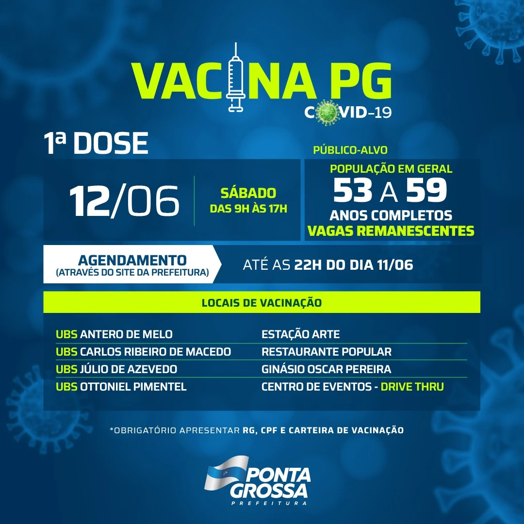 COM ASSESSORIAS - Na tarde de hoje (11), a Prefeitura de Ponta Grossa, abriu agendamento para população geral, com idade entre 53 e 59 anos, para a aplicação da vacina contra a Covid-19. A ação acontecerá neste sábado (12), das 9h às 17h. A abertura para esta faixa etária aconteceu devido doses remanescentes.