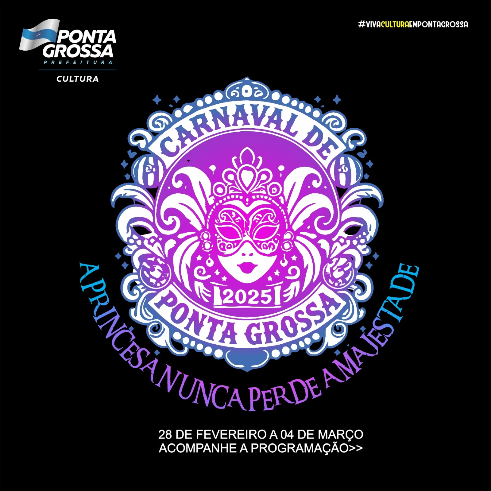 COM ASSESSORIAS - A Secretaria Municipal de Cultura de Ponta Grossa definiu a programação do Carnaval de Ponta Grossa - 2025, que tem como tema ‘A princesa nunca perde a majestade’. Neste ano, a folia acontece entre o final de fevereiro e início de março. A abertura oficial será no dia 28 (sexta-feira), 19 horas, no Palco do Samba, que será instalado no Parque Ambiental. Antes disso, no dia 22, a Secretaria realiza o ‘Grito de Carnaval’, também no Parque Ambiental. Até a terça-feira, dia 4, estão previstos desfiles de blocos e escolas de samba, matinês, concurso de fantasias, escolha da Rainha do Carnaval e do Rei Momo.