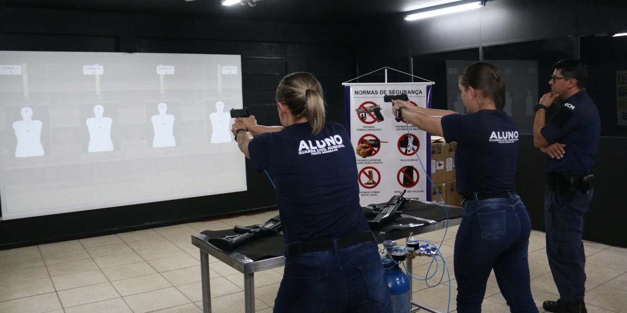 COM ASSESSORIAS - A Guarda Municipal, da Prefeitura de Ponta Grossa, iniciou as aulas práticas de tiro, no estande virtual, para os 100 recém-contratados agentes da corporação, que estão na fase de formação de guardas municipais. O curso que teve início no dia 1º de março conta com uma carga horária de 650 horas de disciplinas teóricas e práticas, as quais darão condições dos alunos, após a conclusão do treinamento, atuarem tanto internamente quanto nas ruas da cidade na segurança pública.