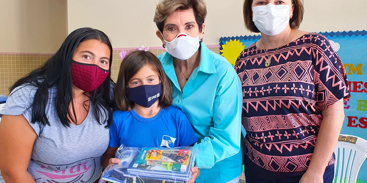 Edla de Fátima Procópio, mãe da aluna Maria Helena, do 1º ano da Escola Glacy Camargo Seco, valorizou a entrega. "Nesta época de pandemia, nós tivemos muitos gastos, muitas dívidas para pagar. Recebendo o material, já é algo a mais que a gente economiza", observa a mãe, que está desempregada e conta no momento apenas com a renda do esposo. A filha também gostou do material novo e contou o que mais gosta na escola. "Eu gosto de fazer amigos, de brincar e de estudar", disse Maria Helena.