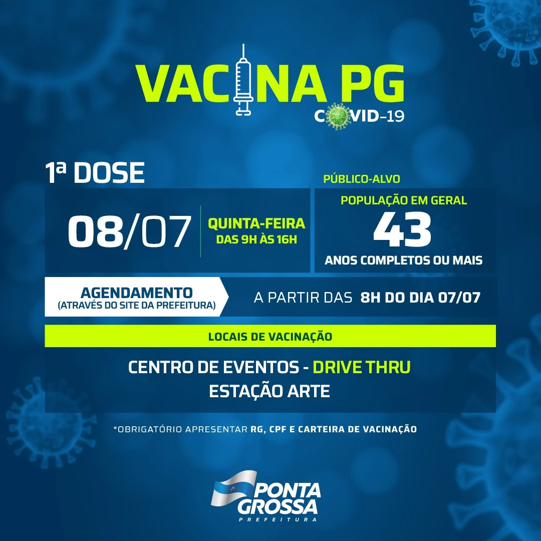 COM ASSESSORIAS - A Prefeitura de Ponta Grossa, através da Fundação Municipal de Saúde (FMS) e do Departamento de Imunização, definiu o cronograma de vacinação, contra a Covid-19, para a próxima semana, de 5 a 8 de julho. Todos os agendamentos para receber as doses serão feitos pelo site oficial (