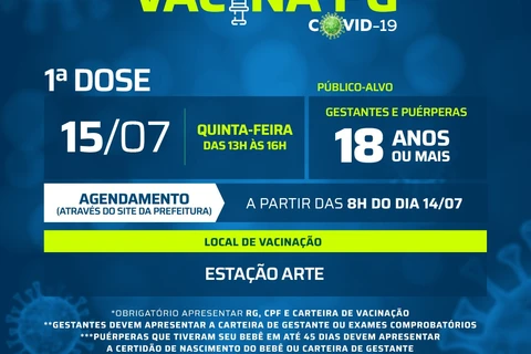 No período da tarde, das 13h às 16h, apenas na Estação Arte, acontecerá a vacinação de primeira dose para gestantes de 18 anos ou mais e puérperas que ainda não se imunizaram. O agendamento também acontece amanhã (14), a partir das 8h, na página da Prefeitura. As gestantes, além do RG, CPF e carteira de vacinação, devem apresentar a carteira de gestante ou documento que comprove. As puérperas que tiveram seu bebê em até 45 dias devem apresentar a certidão de nascimento do bebê ou a carteira de gestante.