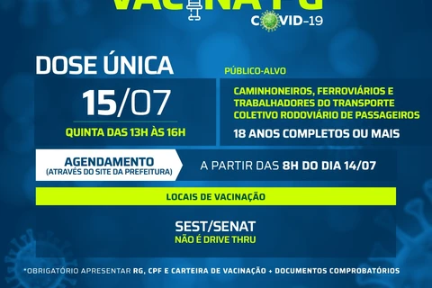 Ainda na quinta-feira (15), também no período da tarde, das 13h às 16h, estará acontecendo a vacinação de dose única para caminhoneiros, ferroviários e trabalhadores do transporte coletivo rodoviário de passageiros, com 18 anos completos ou mais. A aplicação será no Sest/Senat, não será modalidade Drive Thru. Todos devem comparecer com RG, CPF, carteira de vacinação e documentos comprobatórios. Será necessário agendar a vacinação no site da Prefeitura, amanhã (14), a partir das 8h.