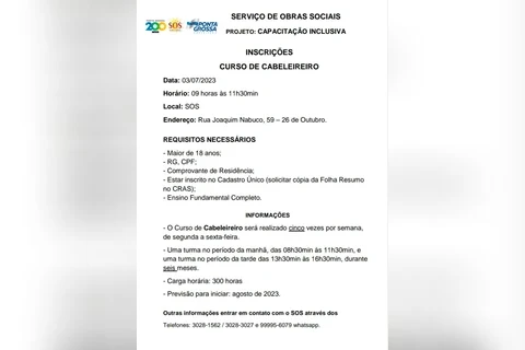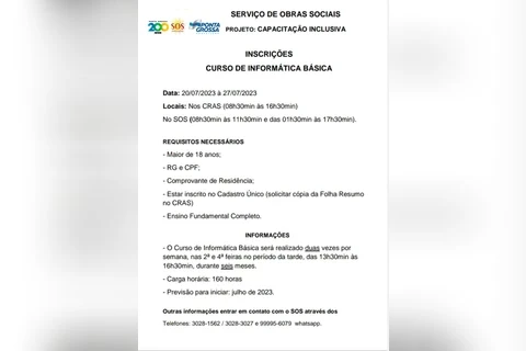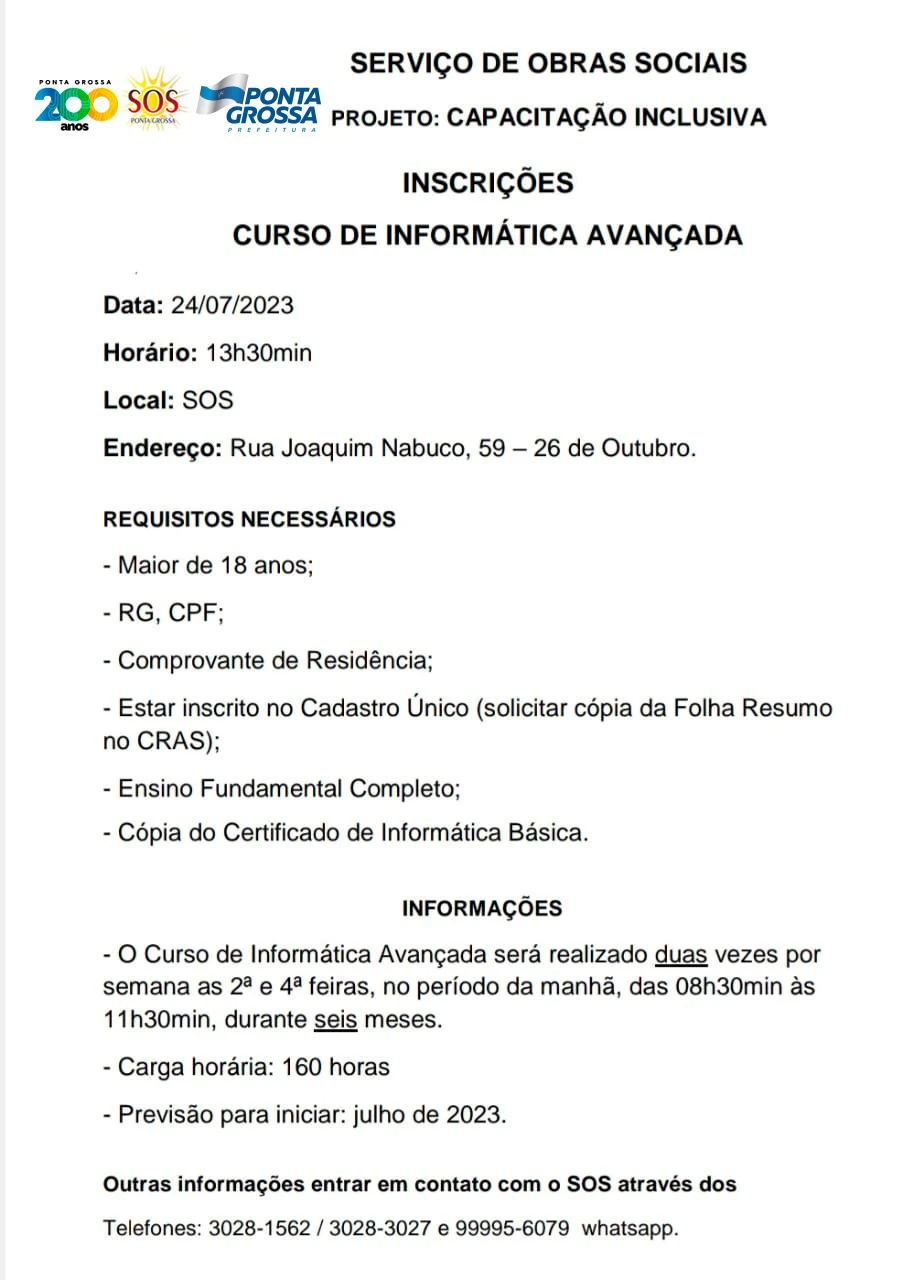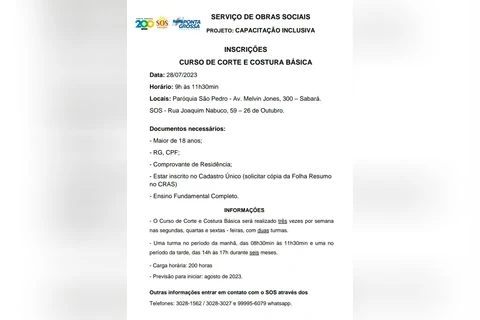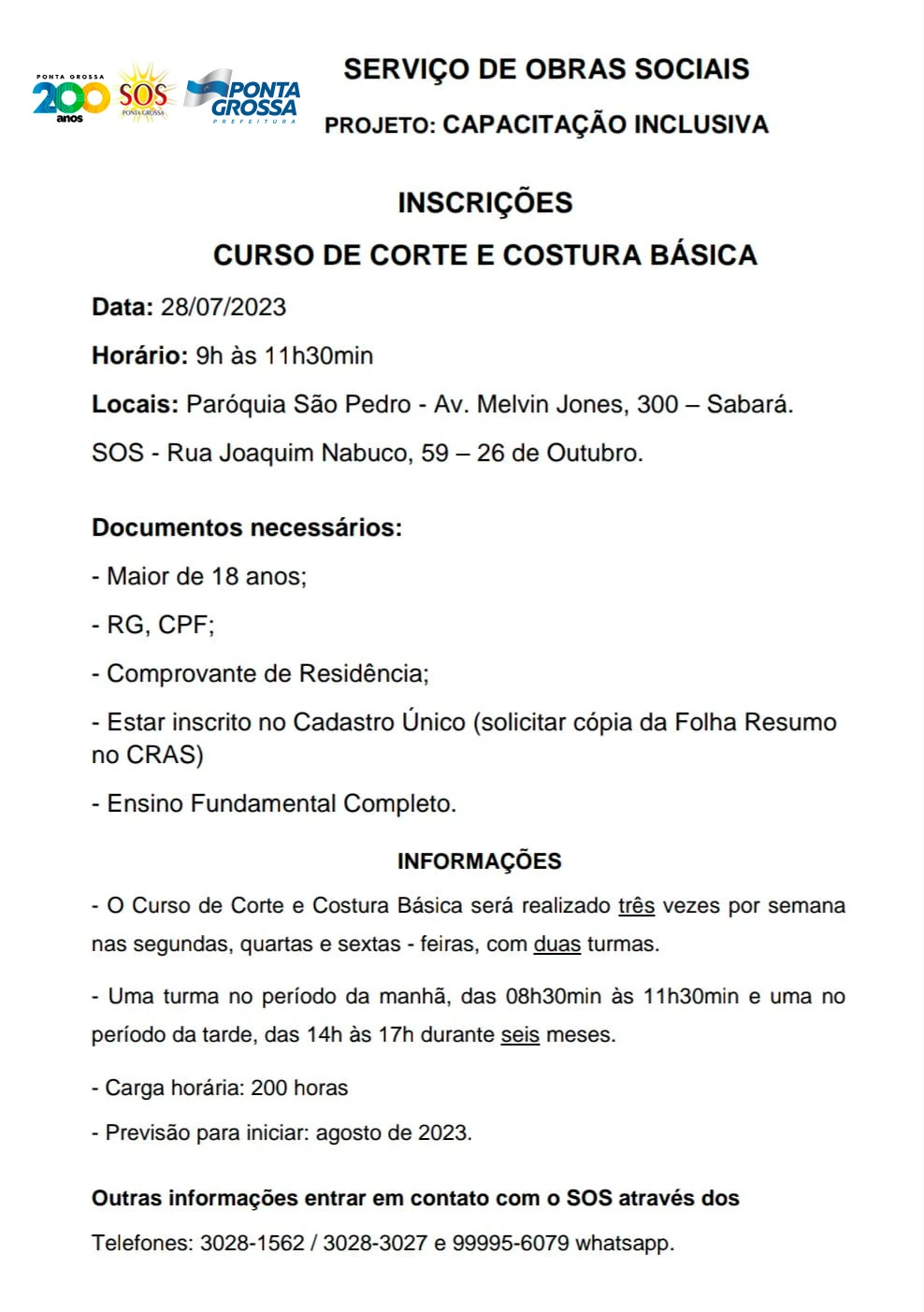 Os detalhes sobre as inscrições, documentos necessários e demais informações sobre os cursos estão em anexo ou nas redes sociais do SOS, que pode ser acessada pelos links abaixo: