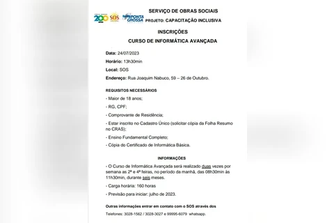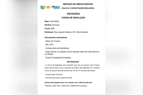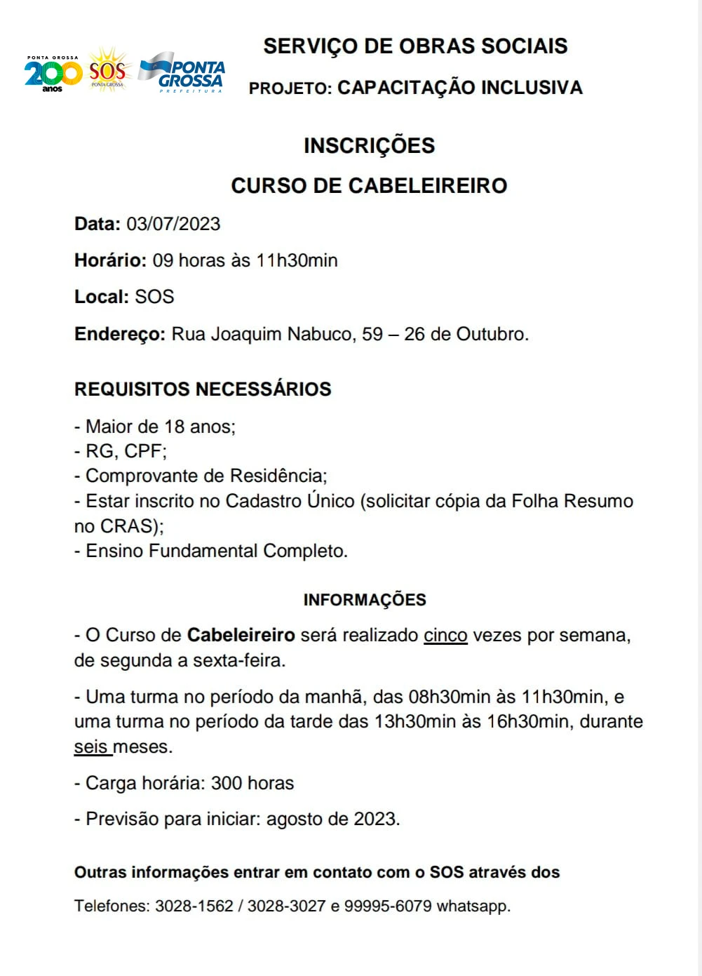 COM ASSESSORIAS - A Prefeitura de Ponta Grossa estará oferecendo nove cursos de qualificação voltados a trabalhadores (empregados ou desempregados), estudantes e pessoas em situação de vulnerabilidade social. Os cursos serão oferecidos através de uma parceria entre a Secretaria Municipal de Indústria, Comércio e Qualificação Profissional, por meio do Departamento de Geração de Emprego e Renda, através do Projeto Capacitação Inclusiva do SOS (Serviço de Obras Sociais). A expectativa é que mais de 520 pessoas sejam qualificadas neste primeiro momento através dessa ação, em cursos como: cabeleireiro; depilação; corte e costura básica; informática básica e informática avançada. A partir do final do mês de agosto deverão ser abertas vagas para outros cursos, como: panificação, manicure e pedicure, confeitaria e salgados.