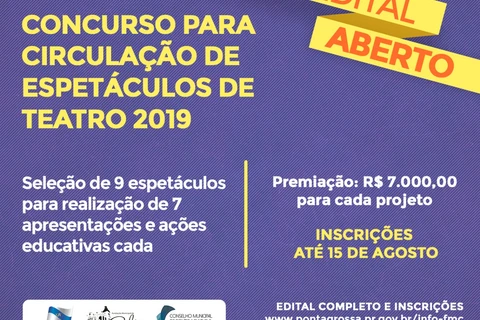 Luane Caroline Nascimento/Ponta Grossa - A Prefeitura de Ponta Grossa, a Fundação Municipal de Cultura e o Conselho Municipal de Política Cultural lançaram esta semana o Concurso para Circulação de Espetáculos de Teatro 2019, com recursos do Fundo Municipal de Cultura. O edital tem a finalidade de estimular a produção na área de teatro e, principalmente, a formação de plateia. Serão premiados nove espetáculos de grupos ponta-grossenses no valor de R$ 7.000,00 cada. Ao todo, serão 63 apresentações até o final do ano espalhadas por toda a cidade.