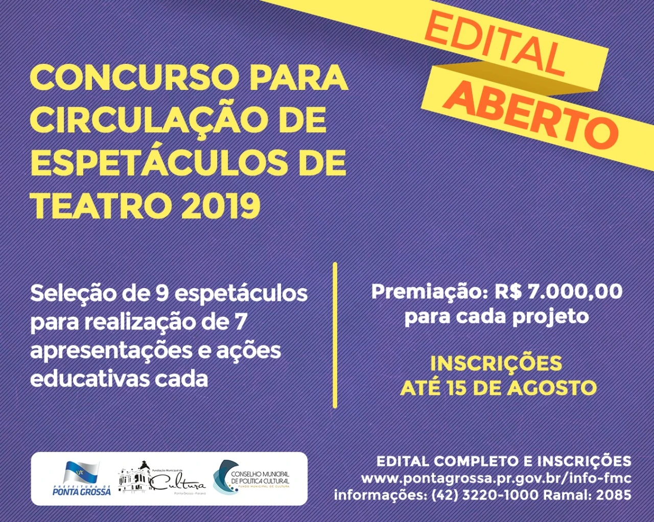 O proponente contemplado com este edital – financiado com recursos públicos - não poderá cobrar ingressos ou vender o espetáculo. O edital atende às demandas aprovadas nas Conferências Municipais de Cultura e estabelecidas pelo Plano Municipal de Cultura (Lei 13.026/2017), e está disponível no site da Prefeitura de Ponta Grossa, na aba ‘Agenda Cultural’. As inscrições são inteiramente online, pelo mesmo endereço. Após a leitura completa do texto possíveis dúvidas podem ser sanadas no telefone 3220-1000, ramal 2085.