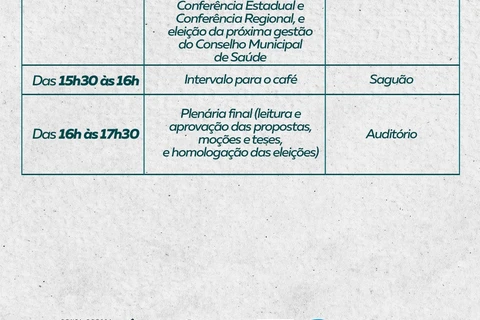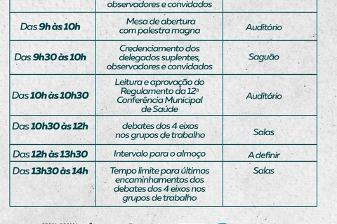 Durante o evento, serão discutidos assuntos de relevância para a saúde do Município, além da eleição de delegados para as Conferências Estadual e Regional de Saúde e escolha dos novos integrantes do Conselho Municipal de Saúde.