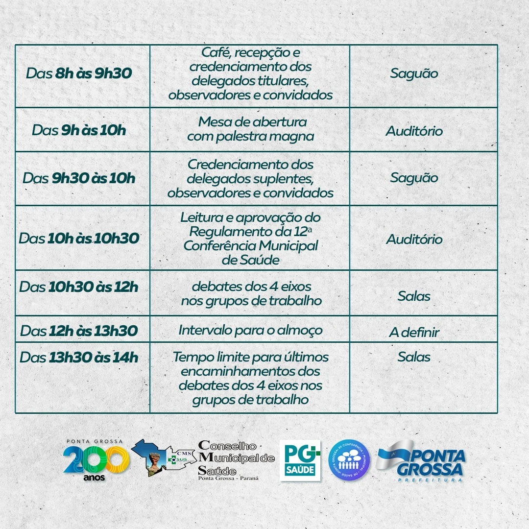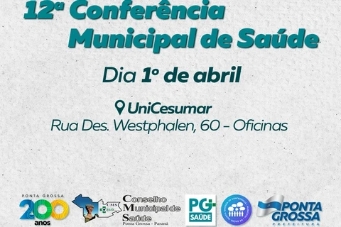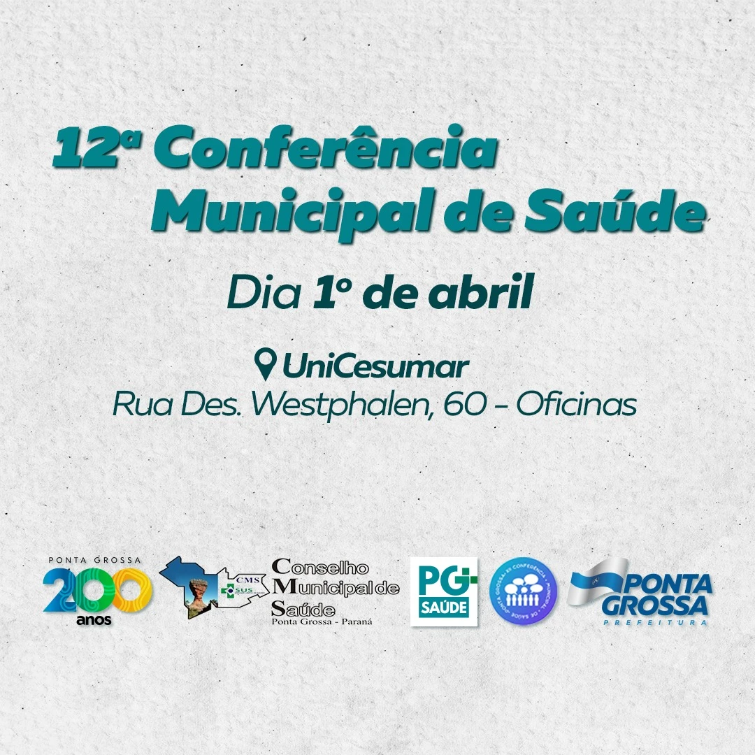 COM ASSESSORIAS - A Prefeitura de Ponta Grossa, através da Fundação Municipal de Saúde e em parceria com o Conselho Municipal de Saúde, promove, neste sábado (01), a XII Conferência Municipal de Saúde. As atividades acontecem no Campus da Unicesumar, em Oficinas, das 8h às 17h30.